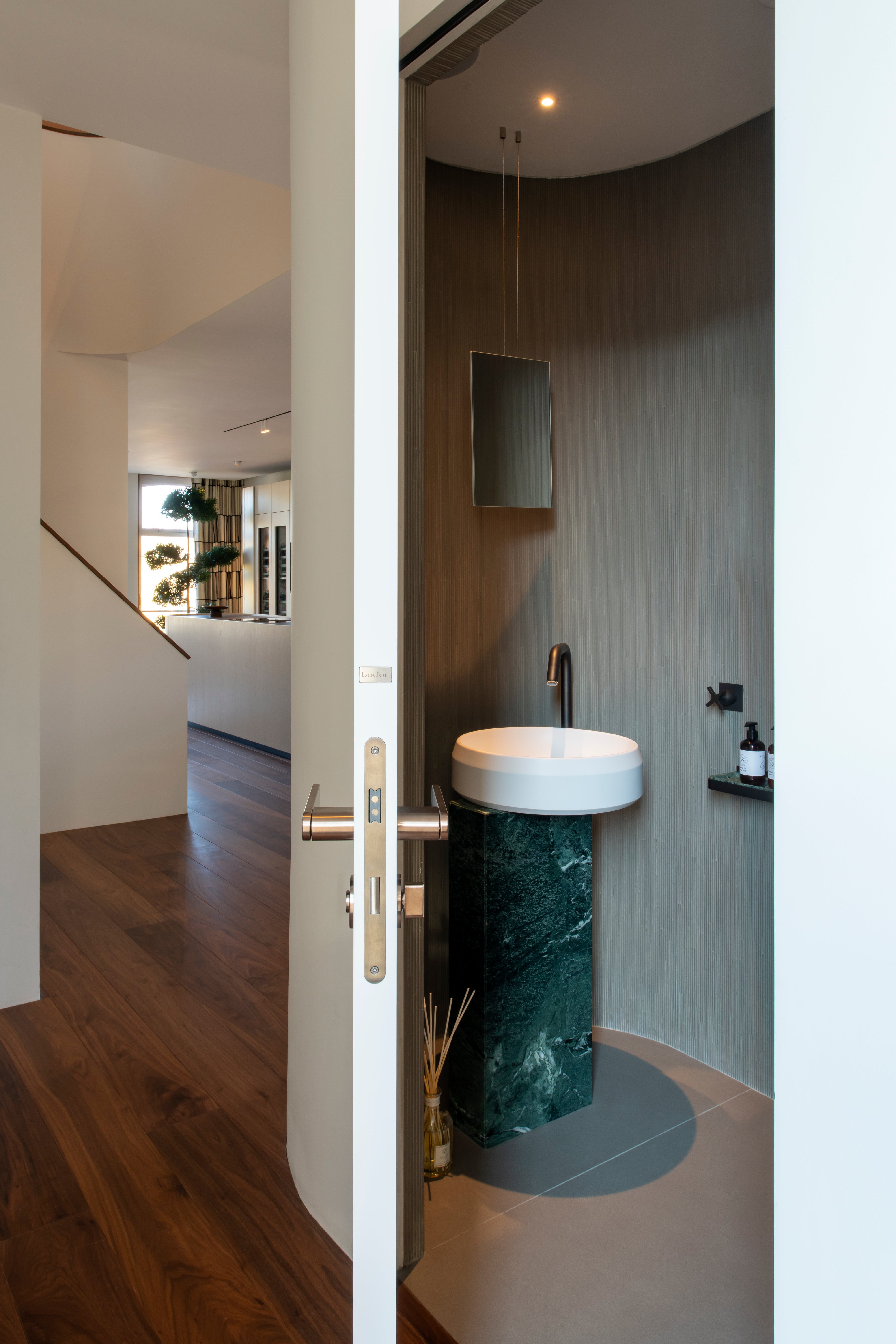 De badkamer is ontworpen met een open concept, wat de ruimte direct toegankelijk maakt vanuit de hal. Aan de buitenkant is een mooie tegelwand van Salvatori zichtbaar. Binnen is de badkamer voorzien van een ruim wandmeubel, een grote douche en een vrijstaand bad van Agape, waarmee comfort en stijl hand in hand gaan.