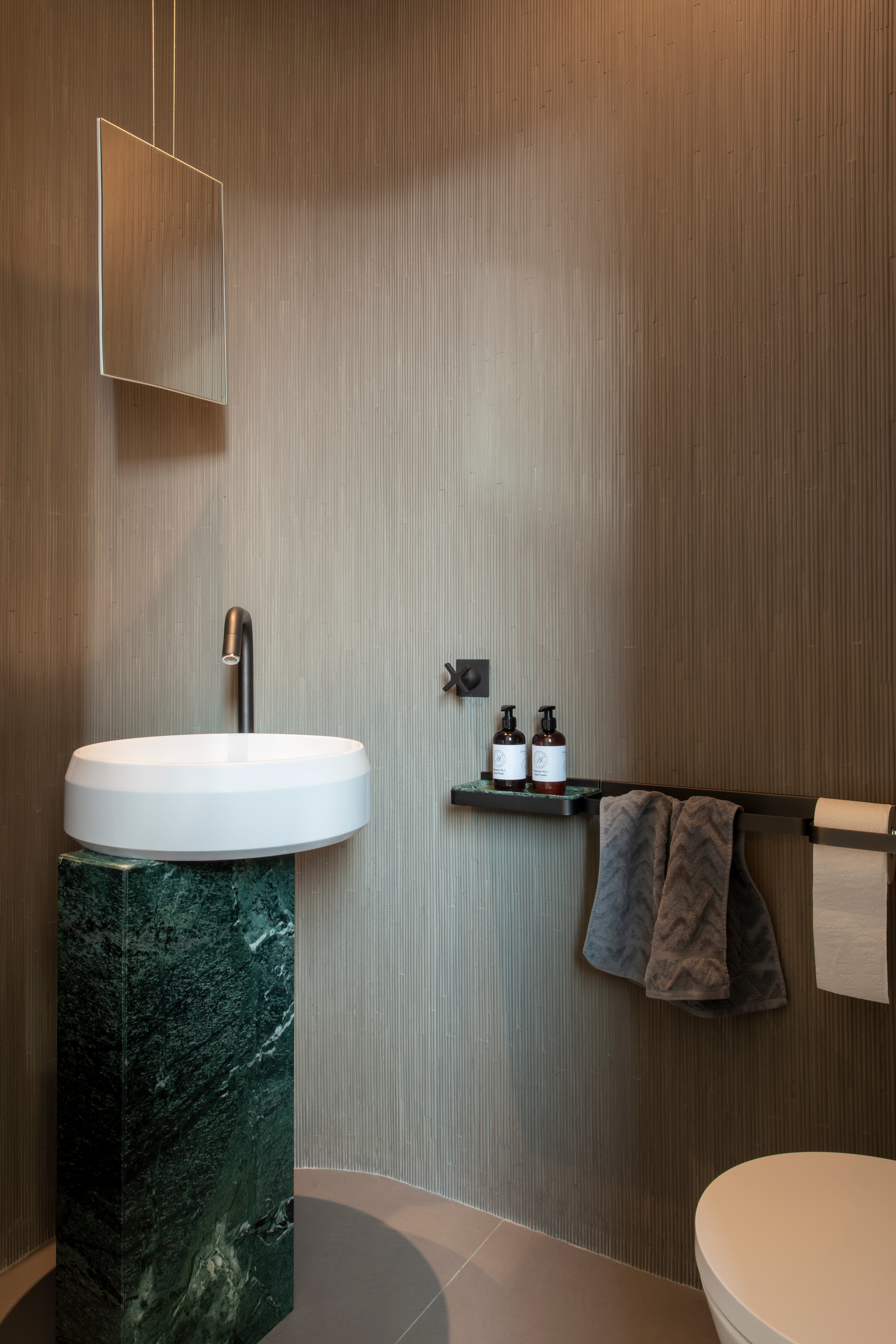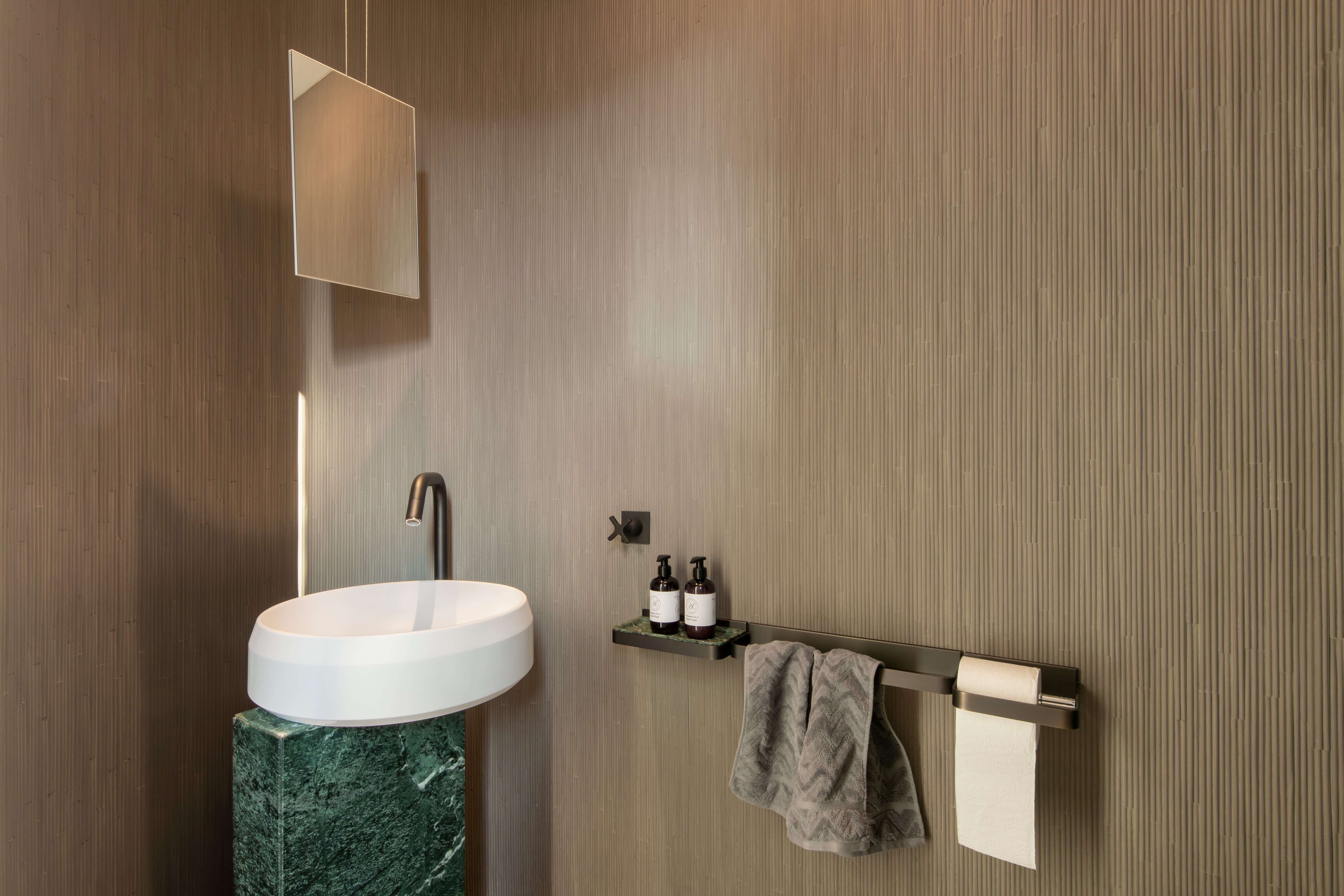Het toilet is bekleed met reliëf mozaïek tegels van Mutina, die de ruimte een bijzondere textuur en uitstraling geven. De vloer is afgewerkt met grote tegels, wat zorgt voor een rustige, uniforme uitstraling. De vrijstaande wastafel Lariana van Agape en de bronzen hardware zijn opvallende details die het toilet een luxe uitstraling geven.