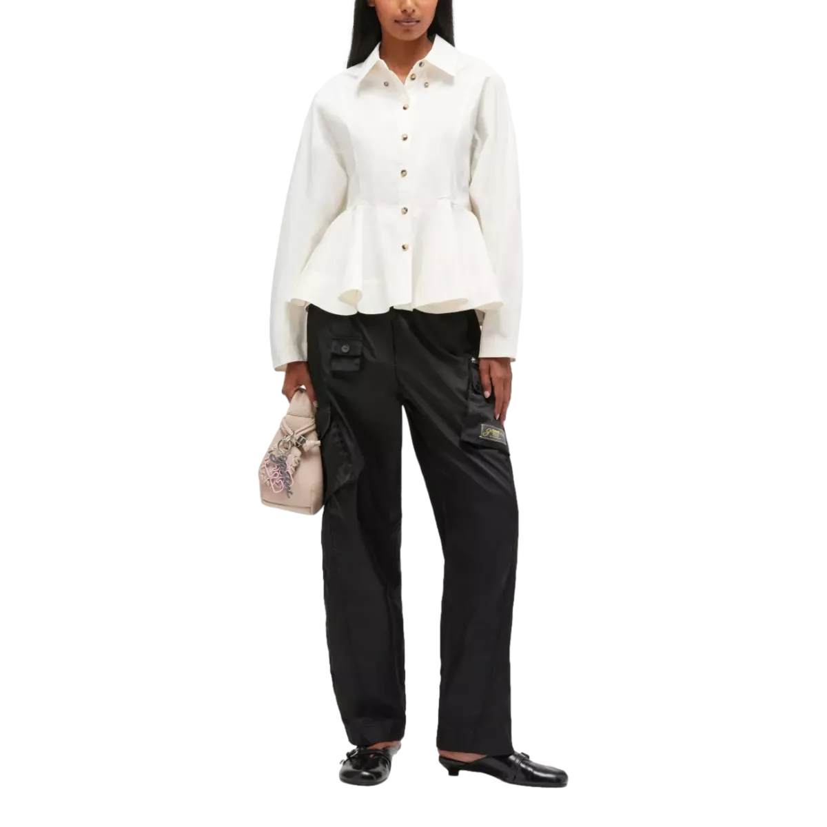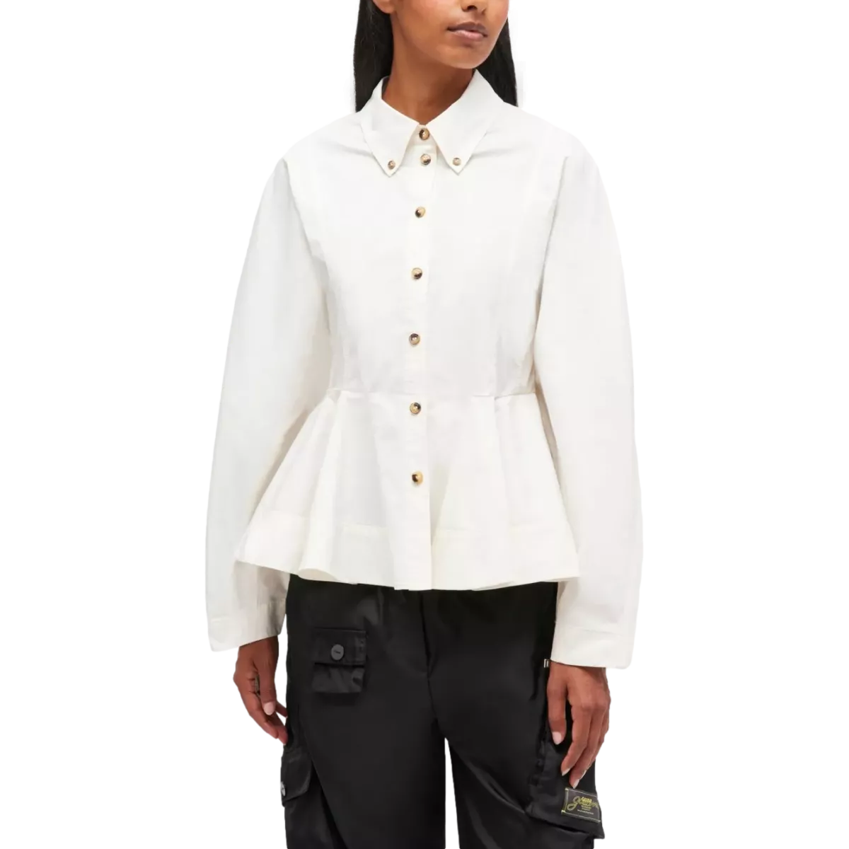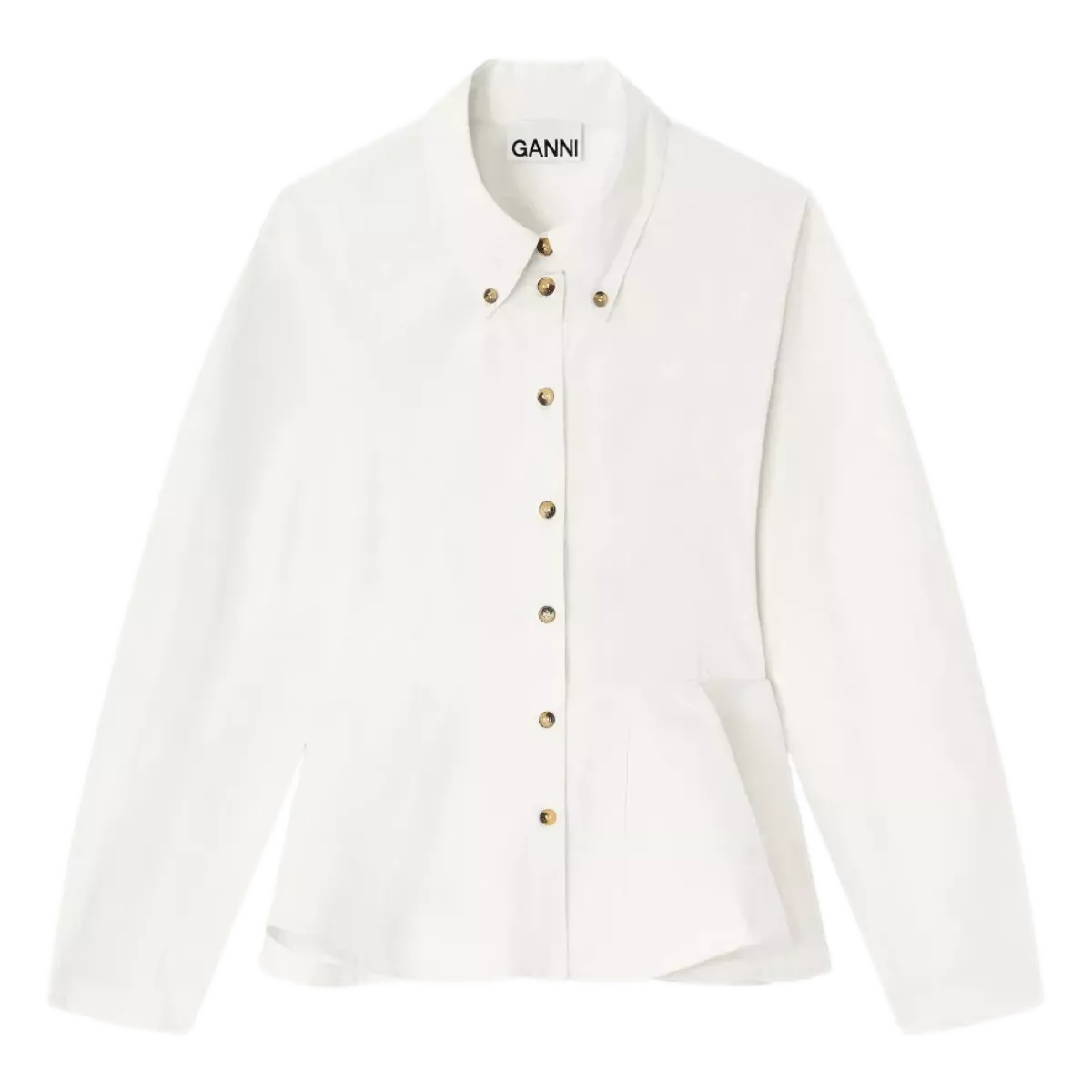 Geef je garderobe een stijlvolle upgrade met deze off-white blouse van Ganni, ontworpen met de kenmerkende mix van moeiteloze elegantie en moderne vrouwelijkheid van het merk. Gemaakt van licht en comfortabel materiaal, heeft de blouse een ontspannen silhouet dat prachtig valt voor dagelijks draagcomfort. Perfect te combineren met jeans, een nette pantalon of een rok — deze veelzijdige blouse geeft elke outfit een verfijnde uitstraling.