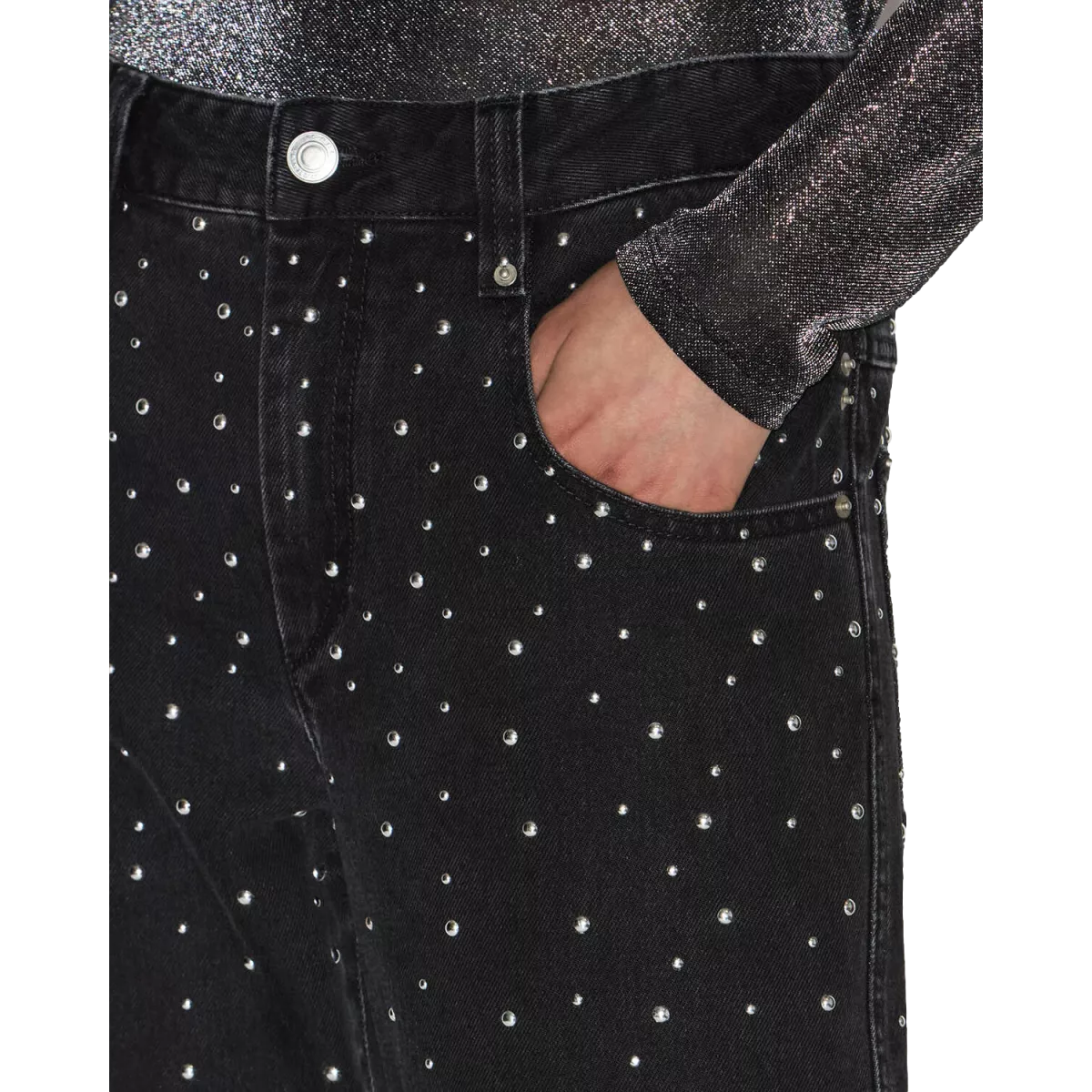 - Details: Metalen studs langs de zakken en naden