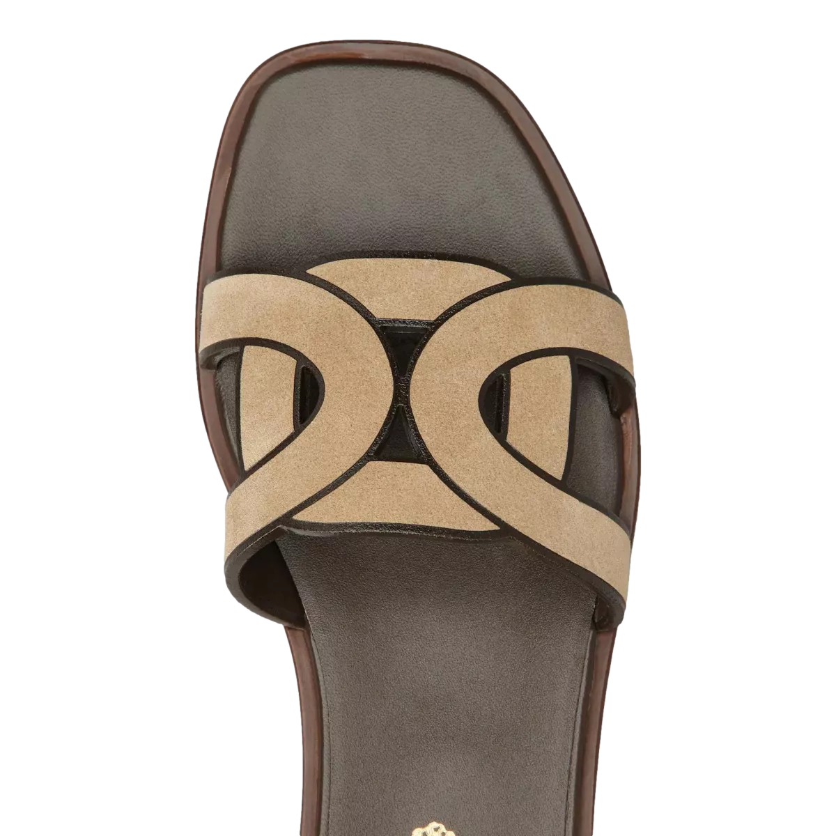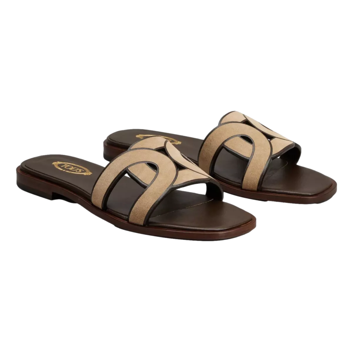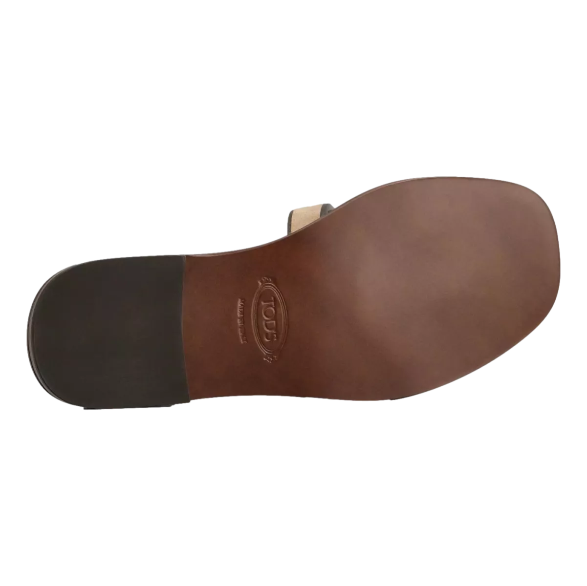 Voeg een elegante touch toe aan uw zomergarderobe met de Tod's Suède Slippers in sand. Gemaakt van zacht suède, hebben deze platte sandalen een vormgegeven band, geïnspireerd op het iconische kettingaccessoire van Tod's voor een stijlvolle en tijdloze uitstraling. De leren zool zorgt voor duurzaamheid, terwijl de rubberen en leren hak extra comfort biedt.