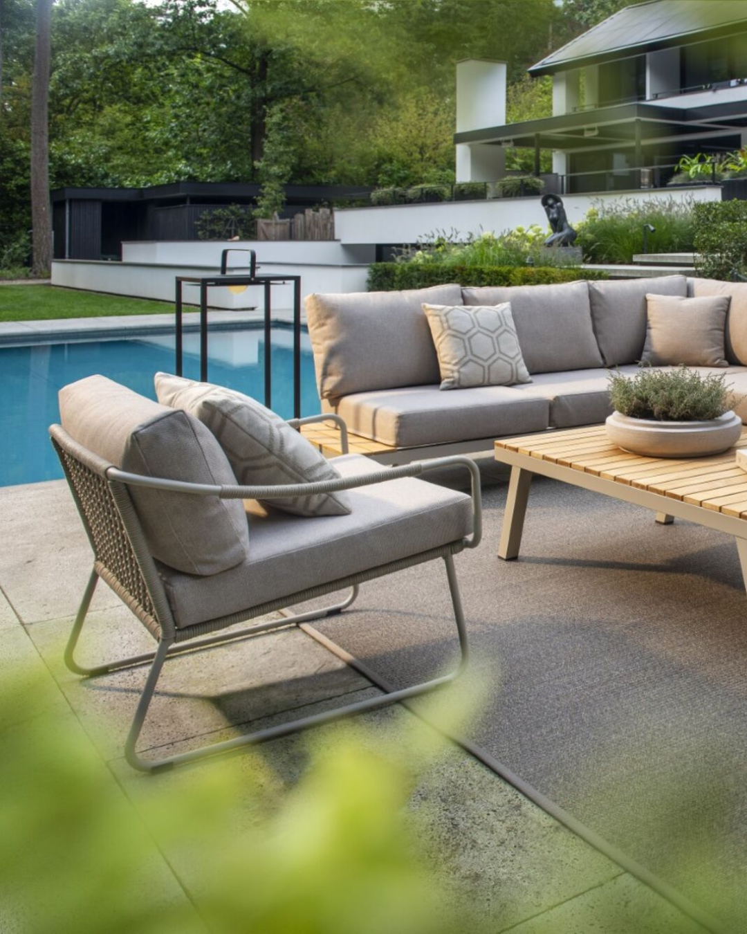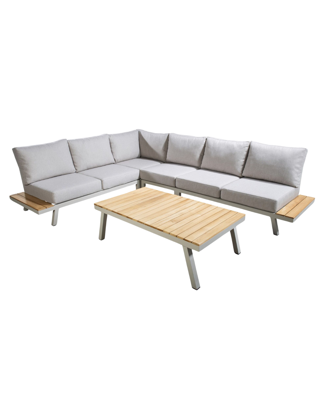 The modern Furago features a sofa with a comfortable high backrest and slightly shorter seat cushions for an active seating experience. The modular Furago lounge set has no armrests but includes a continuous frame that can serve as a table for keeping snacks and drinks within easy reach. This sturdy, weather-resistant aluminum frame is crafted in a warm Salix tone and inlaid with beautiful plantation teak wood. The legs of the Furago sofa angle outward, similar to those of the Furago side table. This side table also has an aluminum frame and a teak wood top. The side table is available in both square and rectangular versions, making it easy to pair with a shorter or longer lounge set in a straight, L-shaped, or face-to-face arrangement. In short, the Furago allows you to arrange your terrace in any way you like.