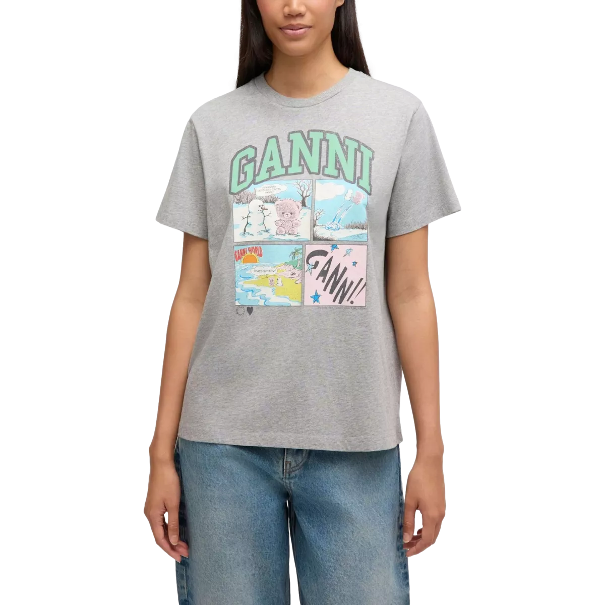 Het Ganni Paloma T-shirt in grijs is een stijlvolle essential met een moderne uitstraling. Dit T-shirt met korte mouw heeft een comfortabele pasvorm en is gemaakt van zacht katoen, waardoor het heerlijk draagt. De subtiele grijze kleur maakt het item veelzijdig en makkelijk te combineren met zowel een jeans als een rok.